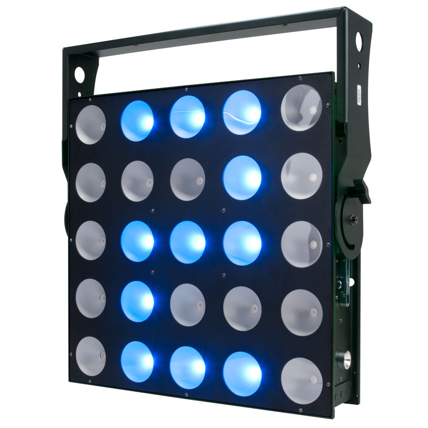 The new CUEPIX Panel features (25) long life 30W 3-in-1 RGB COB LEDs, a 60° beam angle, RDM (Remote Device Management), individual control of each COB module, variable / selectable dimming curves, strobe and zone chase effects, flicker free operation for TV and Film, 3pin and 5pin DMX and powerCon in/out connections, LCD menu display with 4 button control panel, integrated rigging points and optional rigging bracket available, and a multi-voltage universal auto switching power supply (100-250v).